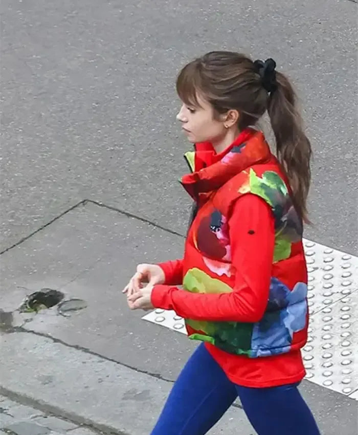 In Season 4 of Emily in Paris, Lily Collins once again captivates audiences as Emily Cooper, this time wearing a vibrant multi-color puffer vest that perfectly reflects her bold and fashion-forward personality. Known for her adventurous wardrobe choices, Emily’s striking reunion vest is a true statement piece, adding playful charm and sophistication to her Parisian-inspired looks.